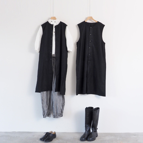 フロントはボタン仕様で、閉じればワンピースのような印象に。開ければレイヤードを楽しむロングベストとして、季節や気分に合わせた着こなしが広がります。