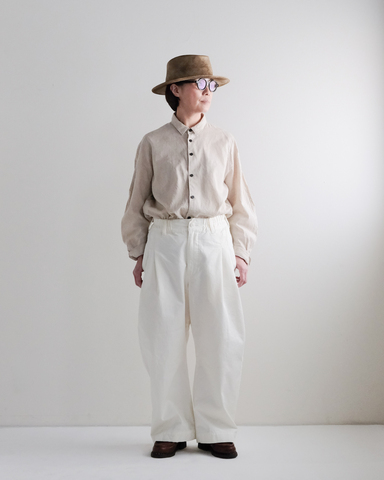 これまでの別注バナナトラウザーよりも、自然なシワ感や落ち感のあるシルエットを楽しめる生地です。
