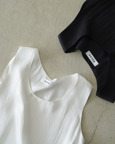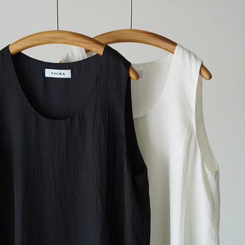 なめらかな落ち感と、さりげない艶が装いに奥行きを与えるノースリーブトップ。