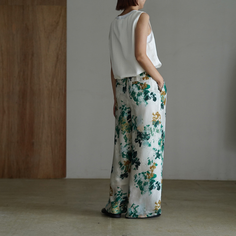 視線を惹きつけるやわらかなフラワープリントが歩くたびに表情を変え、装いに奥行きをもたらすワイドパンツ。