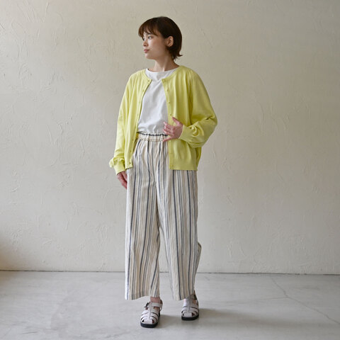 手織りのストライプ生地が主役のパンツ。