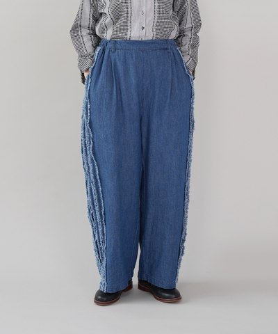 コットンのやさしい肌触りとリネンならではの軽やかさを兼ね備え、デニムでありながら重たさを感じにくい仕上がりとなっています。