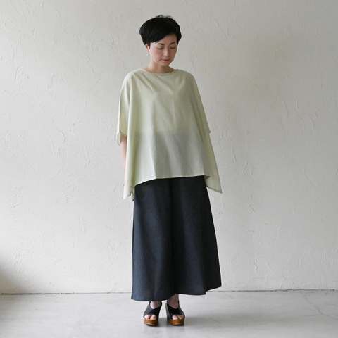 薄手のゆったりトップスにあえてAラインのボトムスを合わせてリラックスコーデ。