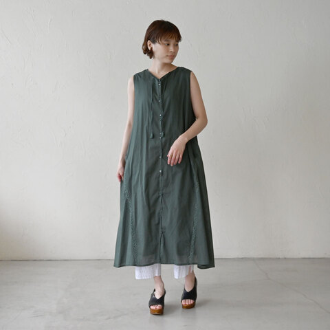 ワンピースに美しい蔦が絡まっているように、手刺繍の線が走ります。