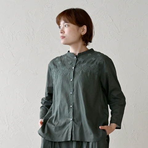 胸元にはいった美しい刺繍をたのしみながら、涼やかに一日を過ごせる一枚です。