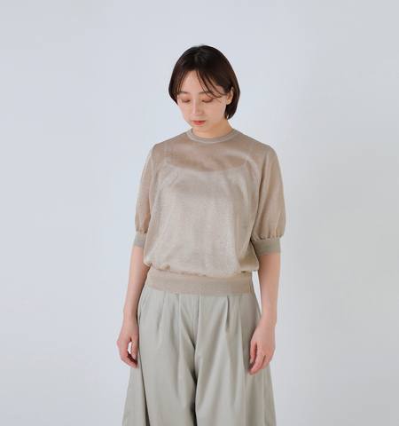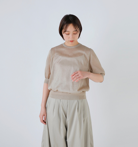 12ゲージの二重臼天竺編みで丁寧に仕立てた、上品な透け感が魅力のラメシアー半袖クルーネック。