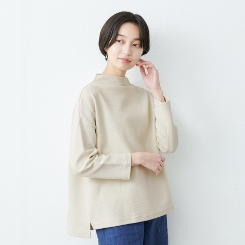 表は凹凸感のあるウェーブ状、裏はうっすらとボーダー状のラインが見える、コットン100%のダブルフェイス素材を使用したプルオーバーです。表と裏とで、糸の色も編み方も変えることで、2パターンの表情をより愉しめる仕様に。上品な印象のモックネックと掛け合わせることで、大人の装いに仕上げました。