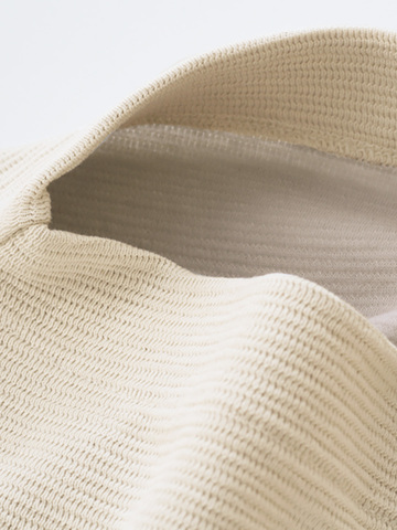 和歌山地区で生産・編立てた、コットン100%素材。表と裏、それぞれ表情も色も異なるダブルフェイスに仕上げました。凹凸感のある表面は、ウェーブ状に編まれ、ニットの様な品があり、肌に当たる裏面は、肌触りの良いなめらかでフラットな組織。表裏2パターンの表情が楽しめる素材です。