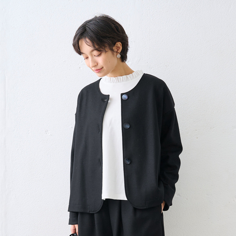 フォーマルもカジュアルもゆったり上品ノーカラー。卒業式や入学式など、きちんと感が求められる場に安心して着られるノーカラージャケット。圧縮ウールの程よい厚みが身体のラインを拾いにくく、ゆったりとしながらも品よく着映えします。当店のジャケットでは珍しい裏地付き仕様で、袖通しがよく、長時間の着用も快適。式典はもちろん、通勤やきれいめな日常スタイルまで幅広く活躍する一着です。