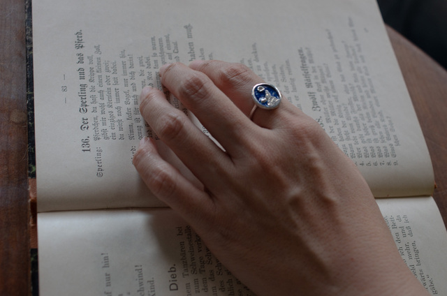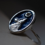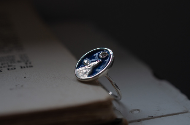 深い青の七宝に、月明かりの夜空を重ね、遠くを見つめる狼の姿をかたどった指環です。 狼の遠吠えは、威嚇ではなく仲間を呼び、存在を確かめ合うためのものだといわれています。 神話や物語の中で、狼は群れを大切にする存在として描かれてきました。 小さく留めたダイヤモンドは夜空に浮かぶ月の光。 強さを誇るためではなく、誰かとのつながりや、大切な存在を思い出すために。 日常の装いにもなじむ、静かな佇まいの指環です。