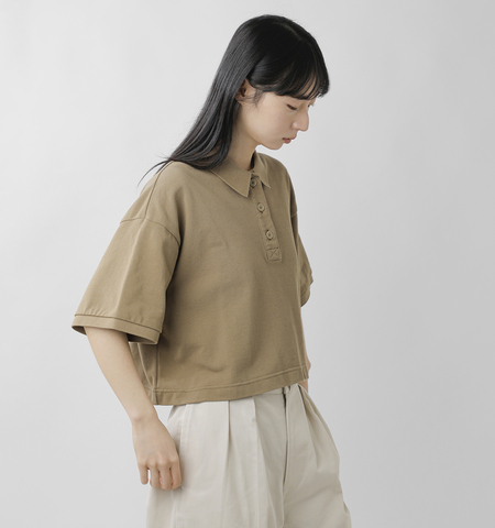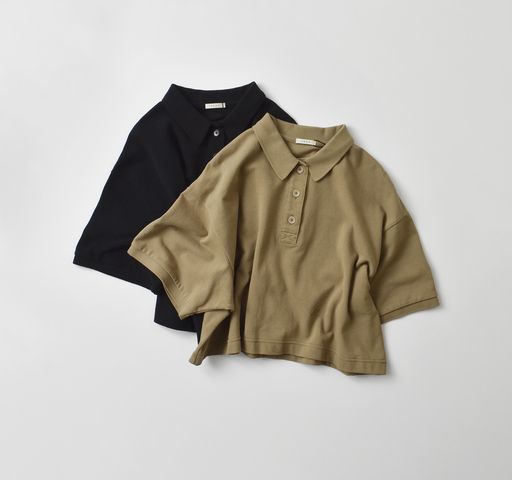 薄手でさっぱりとした肌触りのクロップド丈のポロ。今期はドライなタッチのハイツイストコットンの鹿の子編み素材で展開します。アクセントとなるワンポイントはLENOの頭文字の『L』をカリグラフィー刺繍で。1枚着はもちろん、ジャケットなどのきれいめスタイルのインナーとしても活躍します。