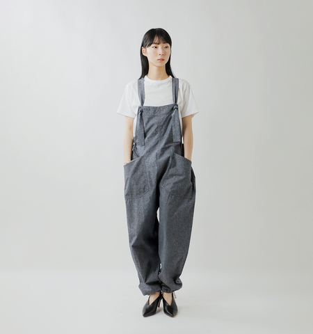 ゆったりとしたリラクシンなムードのサロペット。縦のラインを意識したシルエットで、女性らしくすっきりと着ることが出来ます。