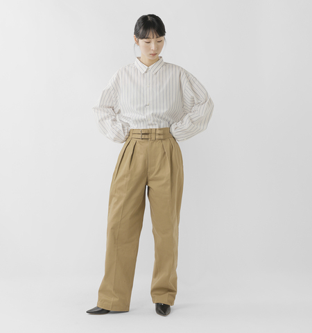 LENOで人気のDOUBLE BELTED GURKHA TROUSERSをリニューアル。ダブルベルトのバックルをアジャスタータイプに、ボタンフライをファスナー仕様に。またシルエットもハイウエストテーパードを継承しながら全体的に少しワイドシルエットにアップデート。クラシックなビンテージテイストのデザインに。穿きやすさをさらにプラスしています。