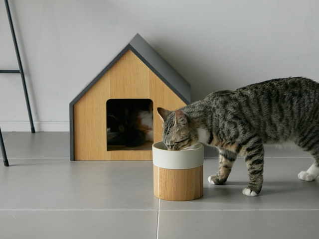 木台の重みが、水飲みの時間を乱さず、磁器の形が、猫の動きを邪魔しない。