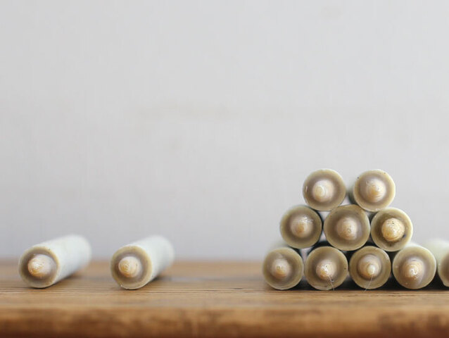 櫨(はぜ)ロウは和ろうそくの原料として最高峰の素材であり、実から2割ほどしか採れない貴重なものです。他のロウと比べて粘り気のある櫨ロウは垂れにくく、植物性のため煙がほとんど出ません。そして太めの芯は和紙とい草でできておりロウをよく吸ってくれます。