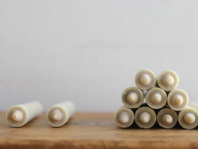 櫨(はぜ)ロウは和ろうそくの原料として最高峰の素材であり、実から2割ほどしか採れない貴重なものです。他のロウと比べて粘り気のある櫨ロウは垂れにくく、植物性のため煙がほとんど出ません。そして太めの芯は和紙とい草でできておりロウをよく吸ってくれます。