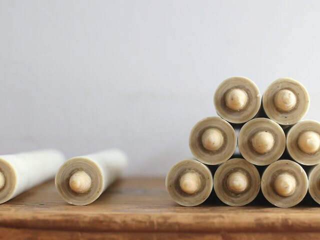 ロウを染み込ませた和紙とい草を巻いた芯に、練って粘り気のある熱い生ロウを素手で塗り重ねていきます。ロウを塗り重ねては乾かしと繰り返すと断面は年輪のような模様になり、表面は型で作ったろうそくの綺麗な肌とは違い、白っぽく温かみのあるざらりとした質感の櫨ろうそくが出来上がります。