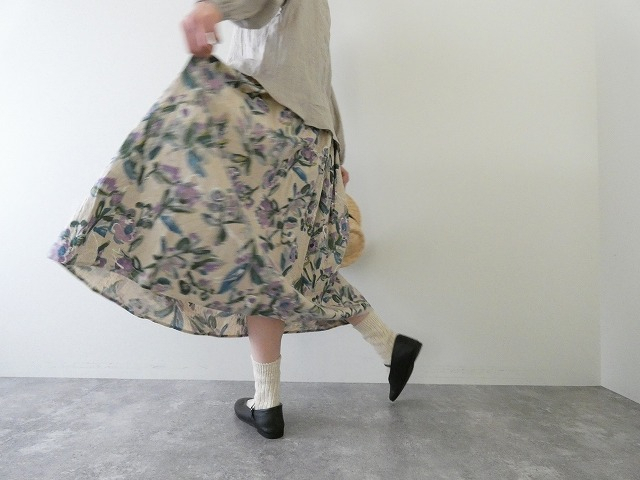 水彩画のようなフラワープリントが目を引く、綿麻素材のタックスカート。