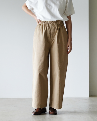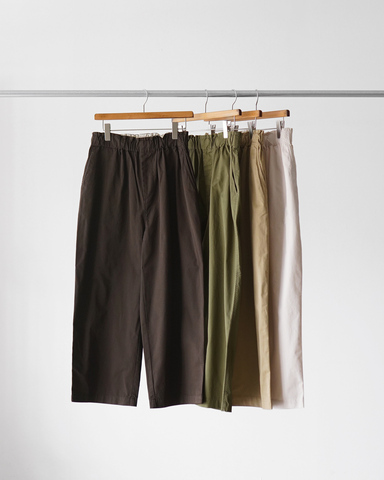 前立てはすっきりと見えるフェイクフロント仕様で、ウエストは総ゴムに内側ドローストリング付きでフィット感の調整が可能。リラックス感のあるシルエットながら、脚のラインを拾いにくく、すっきりとした見え方に仕上げています。