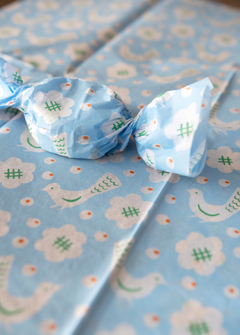 50x76cmの透け感あるラッピングペーパーは、ハリのあるマットな手触り。FSC認証紙にリソグラフ印刷でプリントされた温かみのある一枚です。