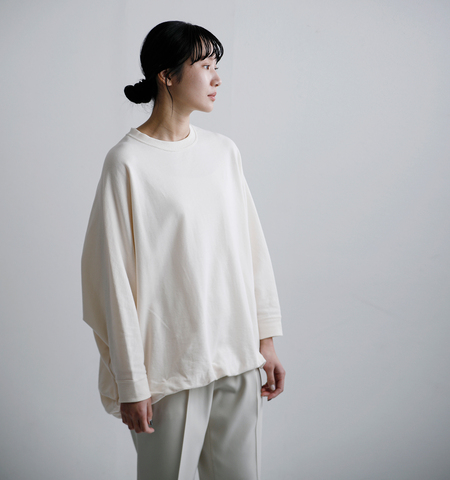 素材には、通常よりも甘く編んだ、柔らかな風合いのスウェットシャツ生地を使用。裏面のパイルは非常にコンパクトかつ薄手で、やわらかな肌触りが特徴です。コットンならではの優しいタッチとソフトなドレープ感があり、着心地の良さと上品な落ち感のあるシルエットを叶えます。