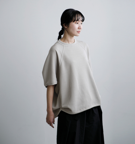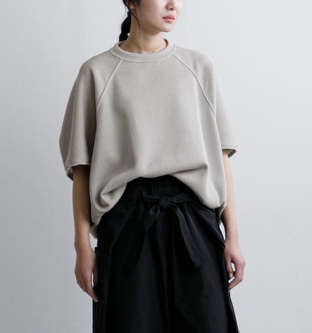 表に8ゲージ、裏に32ゲージという異なる編み地を接結したジャージ素材を使用しています。ローゲージのニットのような見た目でありながら、裏面にはハイゲージのさらっとした肌触りを備えており、見た目の存在感と着心地の良さを両立。通気性が良く、ドライなタッチで、肌離れも快適です。程よいハリがあり、フォルムをきれいに保ちやすいのも特長です。ニットの表情を持ちながら、カットソーのように気軽に取り入れられる素材です。