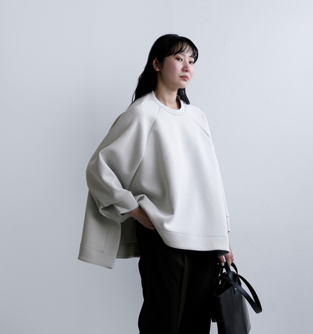 立体的なフォルムを美しく保つ、段ボールスウェット素材を使用。適度なハリと弾力があり、スウェットでありながらカジュアルになりすぎない上品な表情が魅力です。ポリエステルをベースに、レーヨンのなめらかさとポリウレタンの伸縮性を加えることで、軽やかな着心地と動きやすさを両立。シルエットを際立たせつつ、ストレスフリーに着用できる素材感に仕上がっています。