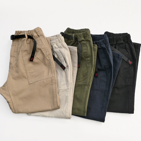 ウエストには片手で調整できるウエビングベルト、180度開脚可能なガゼットクロッチなどのグラミチパンツと仕様はそのままです。生地はコットンツイル。薄くも厚手でもない程良い生地感は、扱いやすくお手入れも簡単。オールシーズン穿いて頂けます。(※ストレッチではありません)