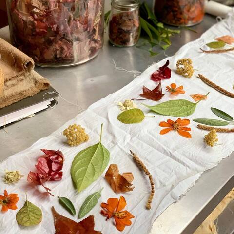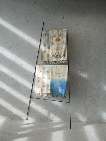 3. 植物の形をプリントした後さらに媒染液へ浸し「染め」を重ねると、植物の生命力が布へ宿りました