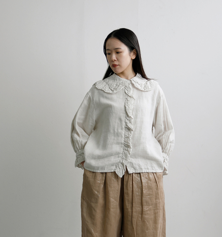 アンティーク調のレースフリルを随所にあしらい、クラシカルな雰囲気を纏ったブラウス。程よい甘さの落ち着きも感じさせる大人可愛い一枚。軽やかな着丈と程よいボリューム感で、パンツやスカートとのバランスも取りやすいデザインです。