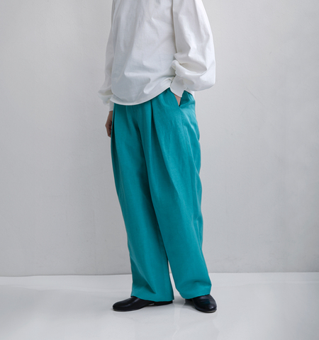 素材には、トリアセテートをベースに麻と再生繊維をブレンド。さらりとした清涼感と上品な落ち感を兼ね備え、ナチュラルでありながら洗練された表情に仕上がっています。