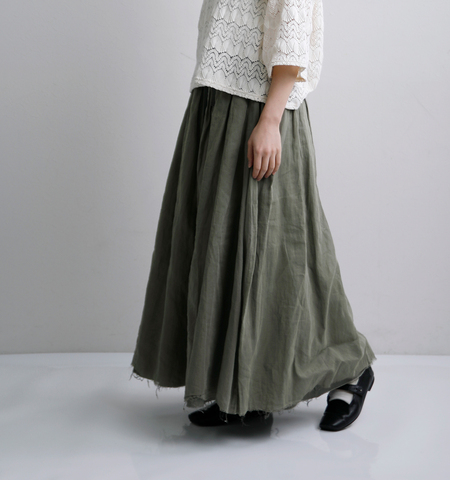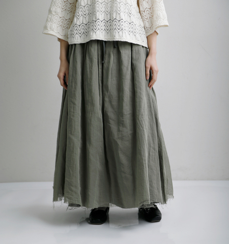 透け感のあるコットンオーガンジーで仕立てた、どこかノスタルジックな雰囲気漂うロングスカート。リメイクスカートのように切り替えやギャザーを施し、表情豊かに仕上げたデザイン。軽やかな素材感と分量たっぷりのシルエットが、動くたびにふんわりと揺れ、装いに奥行きをもたらします。繊細な透け感を活かしたレイヤードスタイルも楽しめ、シーズンレスで活躍する一枚です。