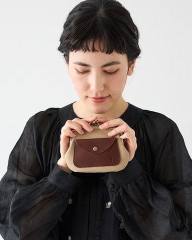 がま口の個性は、素材によって大きく変わるもの。こちらはKanmi.の中でも珍しい、布地がメインのアイテム。8号帆布のざらっとした質感と、ダークブラウンの革の組み合わせが、素朴なかわいらしさを引き出しています。布ならではの軽さも、魅力的です。