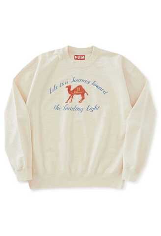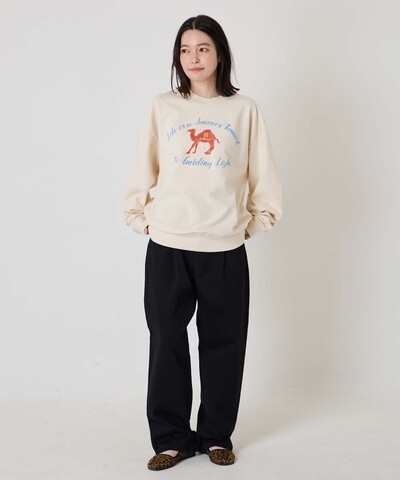 ヴィンテージスウェットなどに見られるカラーフロッキーでプリントを表現したクルーネックスウェット。アイコニックなキャメルをモチーフに、手作業で色付けされる味わいあるプリントです。