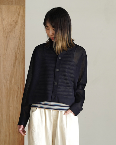 透け感のあるジャカード編みが、春夏らしい清涼感をもたらし、冷房対策や季節の変わり目にも活躍。日常からお出かけまで幅広く取り入れやすく、上質感と着回し力を重視する方におすすめの一着です。