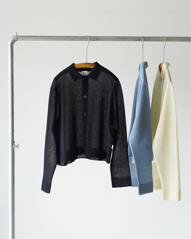 こちらは、装いに程よいきちんと感を添えながら、軽やかに羽織れる衿付きニットカーディガン。ポロシャツのような端正な衿元と、ボタンフロントのデザインが、カジュアルすぎない大人の印象を演出します。