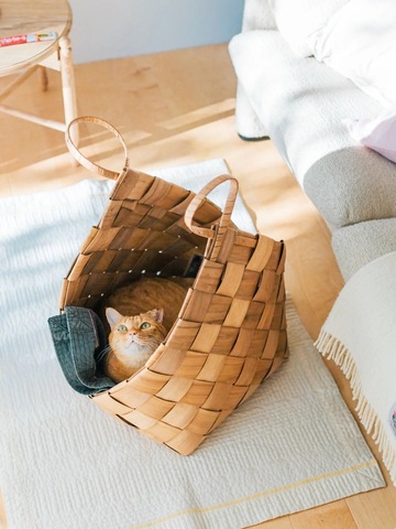 サイドが大きく開いているので出入りしやすいようで、猫たちはハウスとしてとても気に入っています。そしてとにかく収納としても優秀です。 このバスケットに入れてしまえばなんでも素敵に隠せます。
