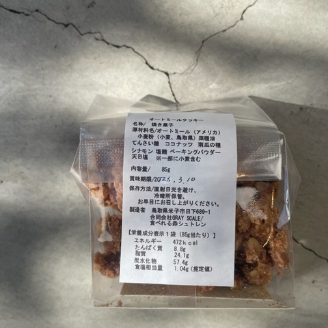 オートミール(アメリカ)、小麦粉(小麦、鳥取県)、菜種油、てんさい糖、ココナッツ、南瓜の種、シナモン、塩麴、ベーキングパウダー、天日塩 ※一部に小麦粉含む