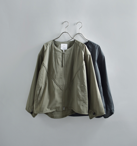 ミリタリーのトレーニングジャケットに見られる機能的なディテールをベースにしながら、無駄を削ぎ落としたノーカラーデザインと立体的なフォルムで、都会的に再構築した一着。
