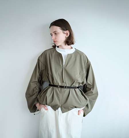 kha:ki(カーキ)より、ドライタッチシャンブレー ノーカラーブルゾン “DRAWSTRINGS JACKET”をご紹介します。ミリタリーのトレーニングジャケットのディティールをベースに、モダンな雰囲気にアップデートを加えたノーカラーブルゾン。表地にはドライタッチなメランジェ調のポリエステルシャンブレーを使用。袖に配したスピンドルを調整することで、丈感やボリュームのアレンジが可能。絞った際に生まれるドレープ感が、立体的で印象的なシルエットを演出します。フロントは着こなしの幅が広がるダブルジッパー仕様で、共地のジッパープルがさりげない統一感をプラス。さらに、衿ぐりにタックを施すことで、奥行きのある立体的なフォルムに仕上げています。