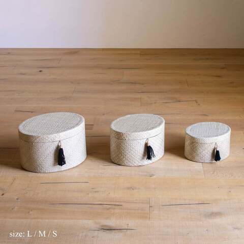 Natural Oval Boxは、柔らかな弧を描くシルエットとナチュラルなカラーが優しい印象のオーバル型の収納ボックスです。ブラックのタッセルがアクセントとなり、シンプルなデザインながら素朴すぎない、上品な佇まい。