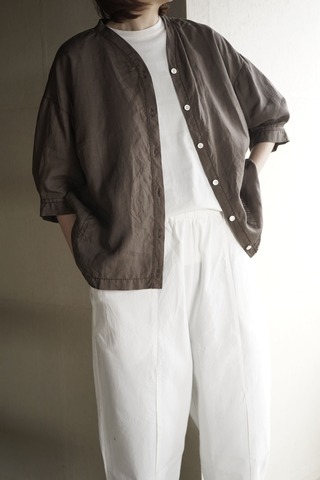 裾ゴムのパンツに目が留まり ついついオーダーしてしまうのですが このパンツもそのうちのひとつ テーパードしたシルエットや ウエストから入れたタックもアクセントになっています