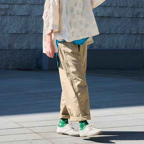 ゆったりとしたフォルムで動きやすく、きれいめにもカジュアルにも合わせやすい一本の30ツイル ノッポパンツです。ゆとりのあるワイドシルエットで体のラインを拾いにくく、リラックスして穿けながらすっきり見える絶妙なバランスのノッポパンツシリーズです。ロールアップも楽しめるデザインなので、靴下や足元のコーデを見せる着こなしも楽しめます。
