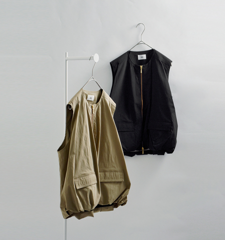タフタ素材でクールに着こなす、立体感のあるレイヤードデザインベスト。