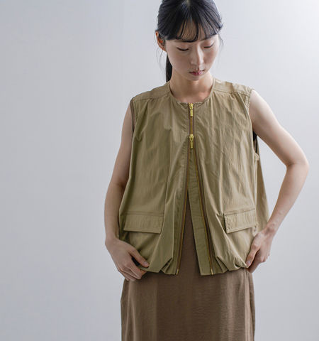 siro de labonte(シロ デ ラボンテ)より、ライトタフタ デザインベストのご紹介をします。薄手でハリ感のあるライトタフタ生地は、非常に軽量でストレスフリーな着心地。立体感のあるシルエットと、さりげなく効かせたデザインディテールがポイント。シンプルなカットソーやシャツ、ワンピースの上に重ねるだけで、いつものスタイリングをぐっと洗練された印象に仕上げてくれます。