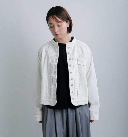 着こむほどにニュアンスのある表情に変化し、経年変化を楽しめるデニム素材。洗いがかかっているので、生地も柔らかく、着始めからストレスフリーな着心地です。デイリーに使って育てたくなる、愛着のわく1着。ステッチも糸もホワイトに統一し、洗練された雰囲気に。
