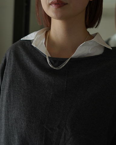 ペンダントトップを通したり、ねじってアレンジすれば、よりパーソナルな表情を楽しめます。日常にも特別な日にも寄り添う、タイムレスなシルバージュエリーです。