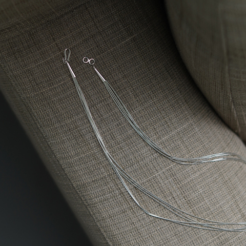 ひとつひとつのパーツは、スターリングシルバー素材で空洞のストロービーズです。中に極細のナイロン糸を通した物を束ねて作られています。