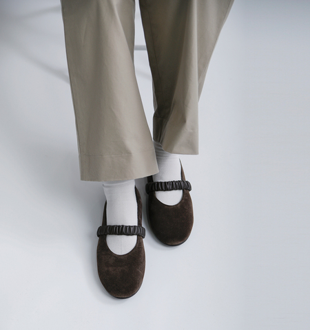 やわらかな表情のスエードレザーで仕立てた、上品であたたかみのあるバレエシューズ。