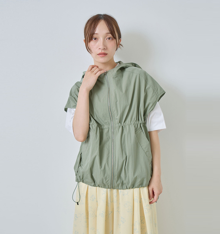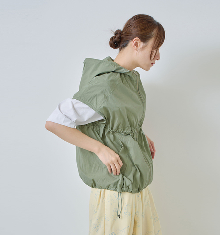 軽やかな着心地と立体的なシルエットが魅力のフード付きジップベスト。